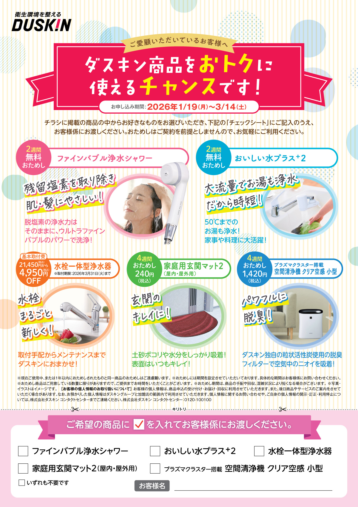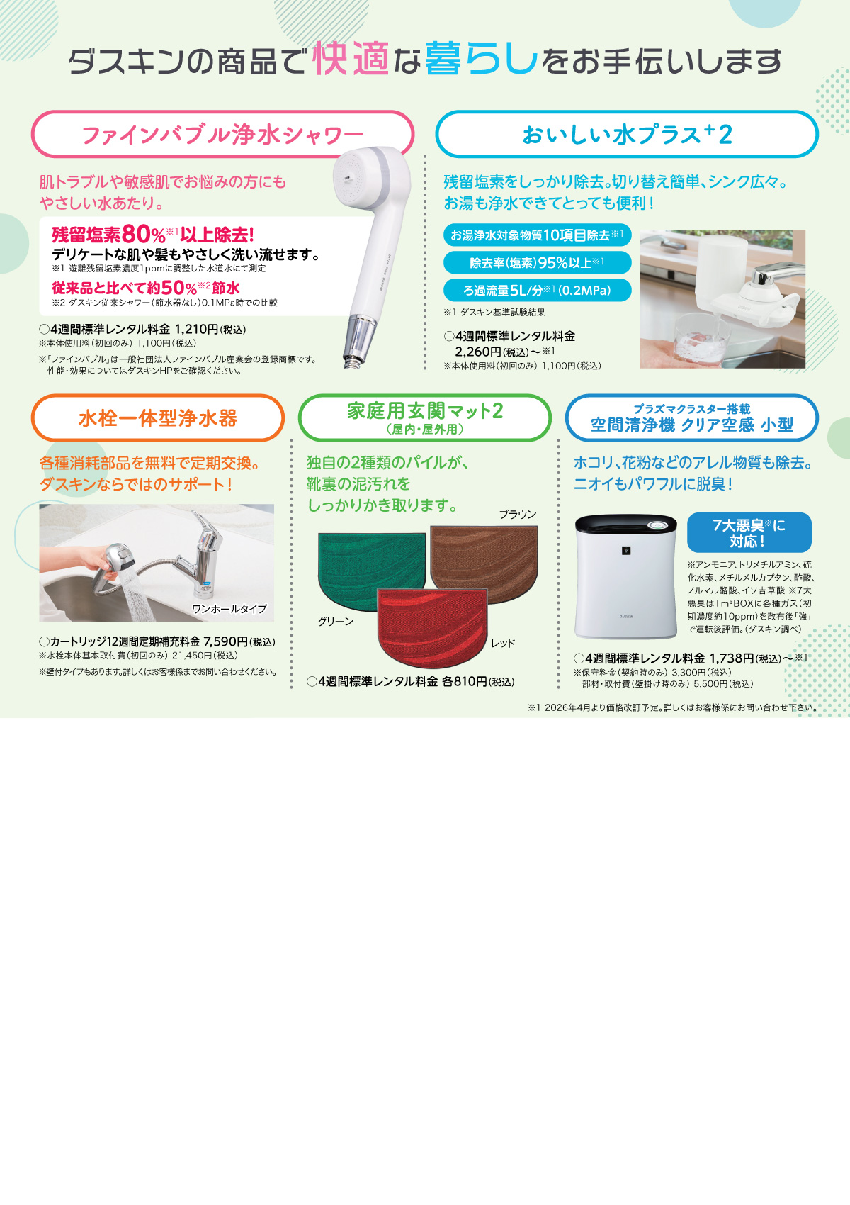 ダスキン商品をおトクに使えるチャンスです! 【2週間無料おためし】 ①ファインバブル浄水シャワー 新発売のファインバブル浄水シャワー。残留塩素を取り除きウルトラファインバブルのパワーで洗浄! ミスト化しないシャワーヘッド構造だから、湯温が下がりにくい。 ②おいしい水プラス+2(大流量カートリッジ) 残留塩素をしっかり除去。お湯も浄水できてとっても便利。 【基本取付工事費OFF】 ①水栓一体型浄水器(ワンホールタイプ) 取付手配からメンテナンス(各種消耗品を無料で定期交換)までダスキンにおまかせ! 基本取付費 21,450円(税込)が16,500円(税込) ②水栓一体型浄水器(壁付用タイプ) 基本取付費 1,100円(税込)が0円 【4週間おためし】 ①家庭用玄関マット2 靴裏の土をしっかり除去。玄関の汚れを防ぎます。 おためし料金 240円(税込) ②空間清浄機 クリア空感 小型 ダスキン独自の粒状活性炭でパワフル脱臭。ホコリや花粉もしっかり除去! おためし料金 1,420円~ |