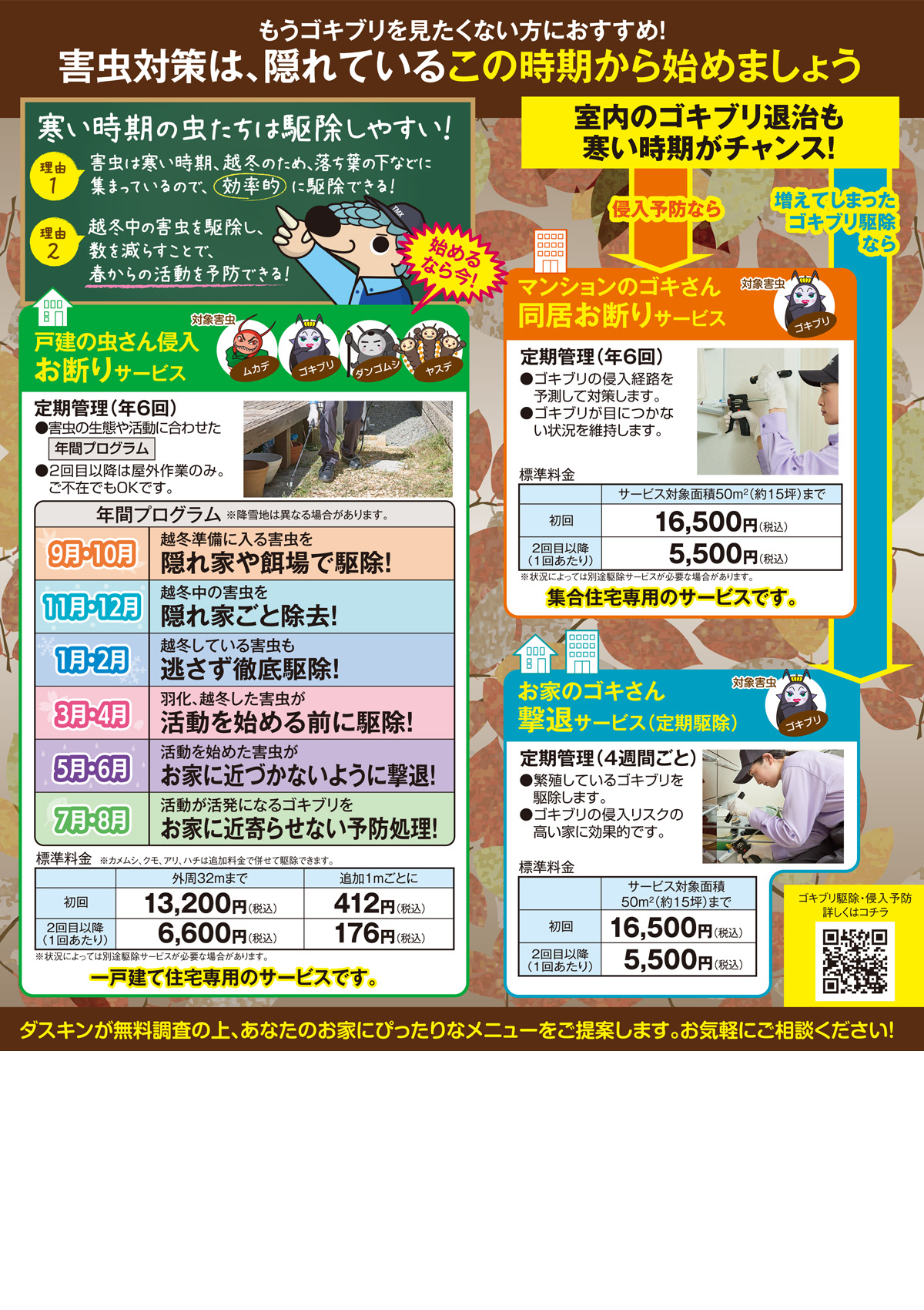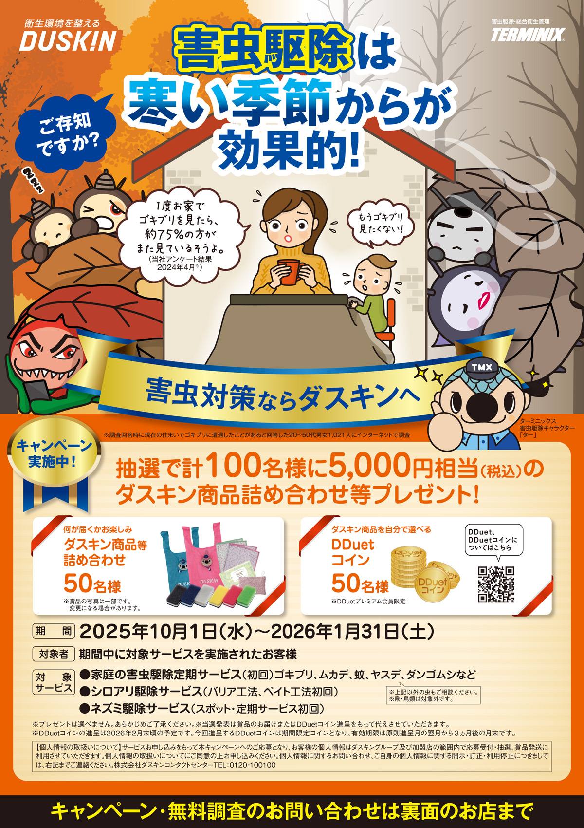 ゴキブリを見たくない! 害虫の駆除&侵入防止は定期管理が安心。 あなたのお家にぴったりなメニューをご提案します。 【ダスキン 秋の害虫駆除キャンペーン】 対象サービスを実施されたお客様から抽選で100名様に5,000円相当のダスキン商品詰め合わせ等プレゼント [キャンペーン期間] 2025年10月1日(水)~2026年1月31日(土) [賞品] ・ダスキン商品等詰め合わせ 50名様 ・DDuetコイン 50名様 [対象サービス] ・家庭の害虫駆除定期サービス(初回)<ムカデ・ゴキブリ・ダンゴムシ・ヤスデ・蚊> ・シロアリ駆除サービスバリア工法 ・シロアリ駆除サービスベイト工法(初回) ・ネズミ駆除サービス(スポット・定期サービス初回) ※プレゼントは選べません。当選発表は商品のお届けまたはDDuetコイン進呈をもって代えさせていただきます。 ※DDuetコインの進呈は2026年2月末頃の予定です。今回進呈するDDuetコインは期間限定コインとなり、有効期限は原則進呈月の翌月から3か月後の月末です。 お得なこの機会にぜひご利用下さい! |
