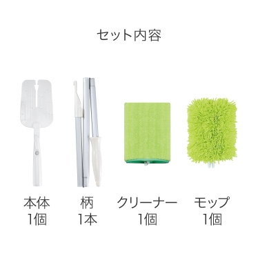 | 材質(主材) | 本体:ポリプロピレン、クリーナー・モップ:ポリエステル・合成ゴム、柄:アルミニウム・ポリプロピレン |
