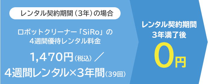 • ※ロボットクリーナーSiRoのレンタル期間中(3年間または2年間)、保証書の受領日以降に発生したお客様要因による故障に対して(「対象外となる場合」に該当する要因は除きます)、お客様が担当店にお支払いいただくレンタル代金の合計金額(税抜52,000円)を免責額の上限として、修理費用の支払いを免除いたします。
