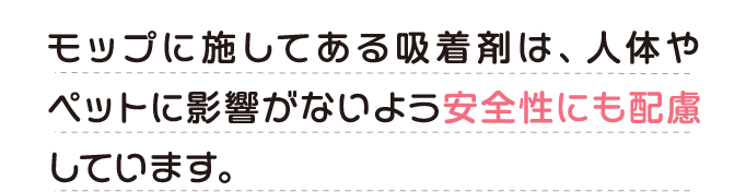モップに施してある吸着剤は、人体やペットに影響がないよう安全性にも配慮しています。 モップに施してある吸着剤は、人体やペットに影響がないよう安全性にも配慮しています。