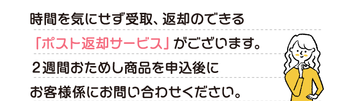 時間を気にせず受取、返却のできる「ポスト返却サービス」がございます。2週間おためし商品を申込後にお客様係にお問い合わせください。 時間を気にせず受取、返却のできる「ポスト返却サービス」がございます。2週間おためし商品を申込後にお客様係にお問い合わせください。