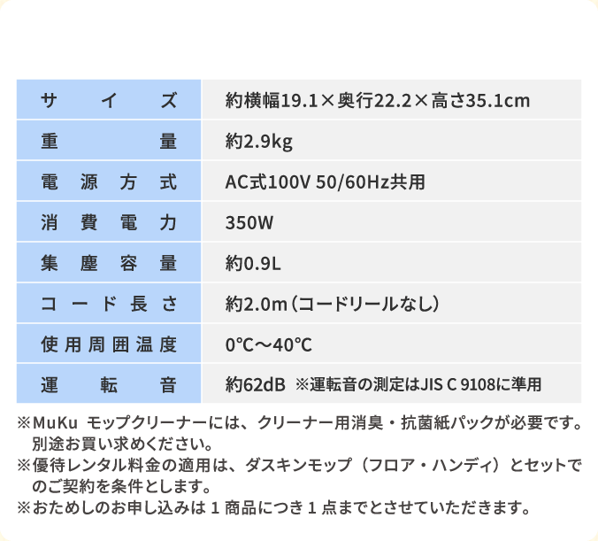 サイズ:約横幅19.1×奥行22.2×高さ35.1cm 重量:約2.9kg 電源方式:AC式100V 50/60Hz共用 消費電力:350W 集塵容量:約0.9L コード長さ:約2.0m(コードリールなし) 使用周囲温度:0℃~40℃ ※MuKuモップクリーナーには、クリーナー用消臭・抗菌紙パックが必要です。別途お買い求めください※優待レンタル料金の適用は、ダスキンモップ(フロア・ハンディ)とセットでのご契約を条件とします。※おためしのお申し込みは1商品につき1点までとさせていただきます。 サイズ:約横幅19.1×奥行22.2×高さ35.1cm 重量:約2.9kg 電源方式:AC式100V 50/60Hz共用 消費電力:350W 集塵容量:約0.9L コード長さ:約2.0m(コードリールなし) 使用周囲温度:0℃~40℃ ※MuKuモップクリーナーには、クリーナー用消臭・抗菌紙パックが必要です。別途お買い求めください※優待レンタル料金の適用は、ダスキンモップ(フロア・ハンディ)とセットでのご契約を条件とします。※おためしのお申し込みは1商品につき1点までとさせていただきます。