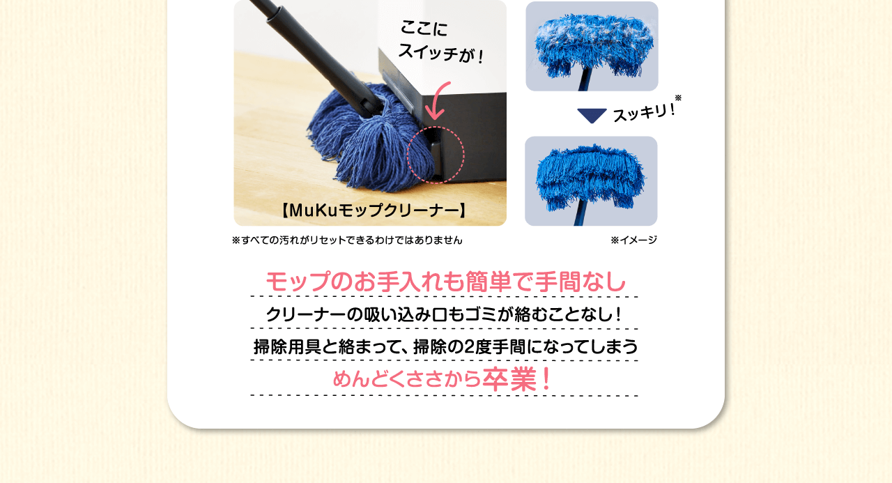 MuKuモップクリーナーの仕様・注意事項はこちら MuKuモップクリーナーの仕様・注意事項はこちら