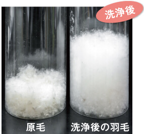 独自の技術で洗浄した羽毛は、こんなにまっしろに。洗浄が不十分だと見た目でわかるほど黄ばみが目立ちます。