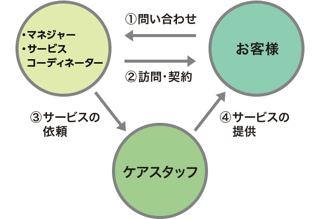 ![[1.お客様から問い合わせをいただきます。][2.マネジャーがお客様宅を訪問し、お客様のニーズを把握し、サービス利用契約を取り交わします。][3.サービスコーディネーターがお客様のご要望を把握した上で、サービスをご提供するケアスタッフを選定しサービスを依頼します。][4.お客様に最適なサービスをお届けします。]](/lifecare/fc/img/equipment_img01_02_sp.jpg)