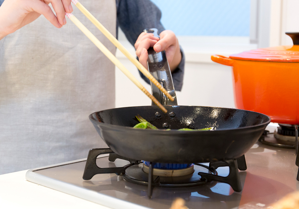 - ②油がこびりついている部分は、ヘラや割りバシなどで、削り落としておきます。