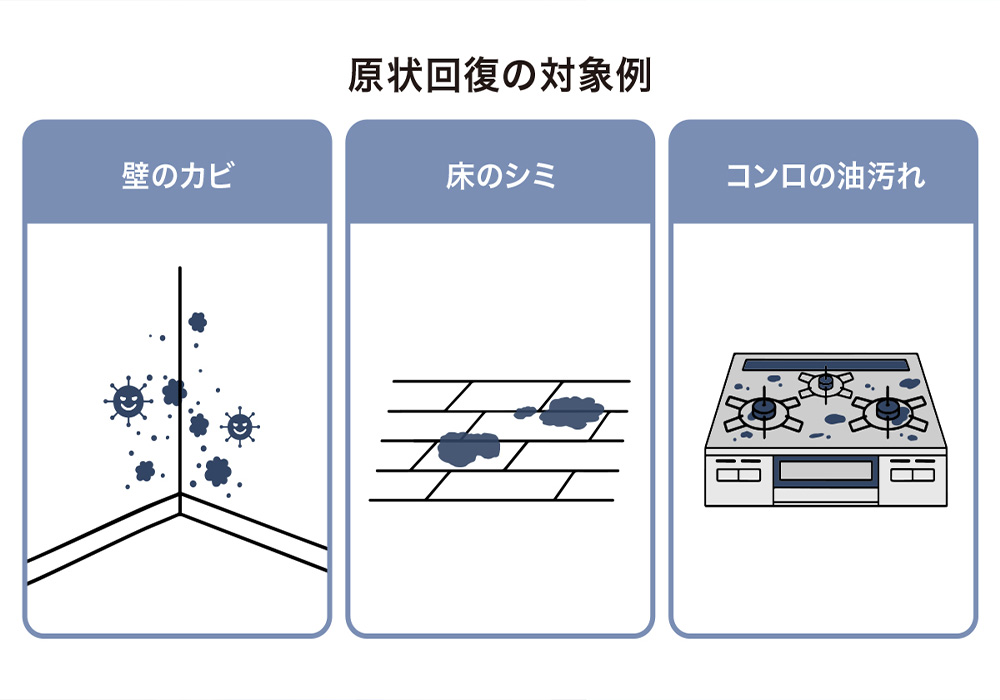 結露や水漏れを放置して発生したカビ・腐食、落書きやモノをぶつけてできた凹み、タバコのヤニによる変色やニオイが対象です。