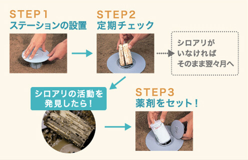 - まずシロアリを確認するためにステーションを設置。シロアリの活動を発見したら薬剤をセットして巣全体に効果的に薬剤が広がります。