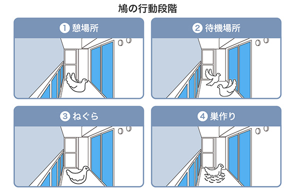鳩はいきなり巣を作るのではなく、段階的に場所を確認します。最初は休憩場所として利用し、安全と判断すると待機場所、ねぐらとして使用するようになり、最終的に巣作りをします。